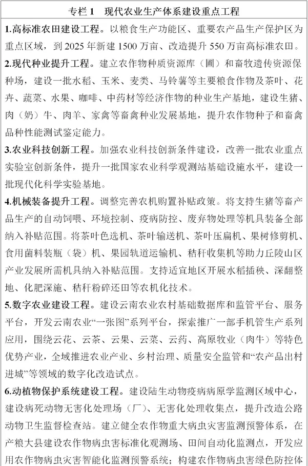 全力穩(wěn)定糧食綜合產(chǎn)能。堅持藏糧于地、藏糧于技,樹立大食物安全觀,立足糧食供需平衡區(qū)的基本省情,確保糧食種植面積穩(wěn)定在6250萬畝左右,在93個稻谷、玉米、小麥等糧食生產(chǎn)重點縣(市、區(qū))集中連片建設(shè)糧食生產(chǎn)核心區(qū),打造一批綠色高質(zhì)高效示范基地。在“九湖兩江”流域大力推廣“水稻+”綜合種養(yǎng)模式,探索水稻田保護(hù)和農(nóng)業(yè)綠色生態(tài)發(fā)展路徑。努力挖掘糧食生產(chǎn)潛能,大力發(fā)展晚秋糧食生產(chǎn)和冬季農(nóng)業(yè)開發(fā),擴(kuò)大小雜糧、小雜豆、馬鈴薯、鮮食玉米等糧食作物面積。到2025年,全省糧食產(chǎn)量達(dá)1950萬噸。縱深推進(jìn)特色產(chǎn)業(yè)發(fā)展。圍繞糧食、茶葉、花卉、水果、蔬菜、堅果、咖啡、中藥材、生豬、肉牛等“綠色食品牌”重點產(chǎn)業(yè),深入實施“一二三”行動,打造“一縣一業(yè)”,抓住種子和電商兩端,推進(jìn)設(shè)施化、有機(jī)化、數(shù)字化發(fā)展。到2025年,“綠色食品牌”重點產(chǎn)業(yè)綜合產(chǎn)值實現(xiàn)翻番。穩(wěn)定糖料蔗產(chǎn)能。鞏固臨滄市、普洱市、德宏州、西雙版納州等適宜區(qū)種植面積,加快中低產(chǎn)蔗田改造,加強(qiáng)適宜丘陵山地機(jī)具的研發(fā)和推廣應(yīng)用,到2025年,全省糖料蔗產(chǎn)量穩(wěn)定在1600萬噸左右。促進(jìn)橡膠產(chǎn)業(yè)轉(zhuǎn)型升級。擴(kuò)面增產(chǎn)、強(qiáng)質(zhì)提特、輻射全國,西雙版納州、普洱市等地區(qū)加快發(fā)展特種膠園,因地制宜發(fā)展生態(tài)膠園,打造國內(nèi)天然橡膠生產(chǎn)供應(yīng)主基地。加快綠色生態(tài)漁業(yè)發(fā)展。