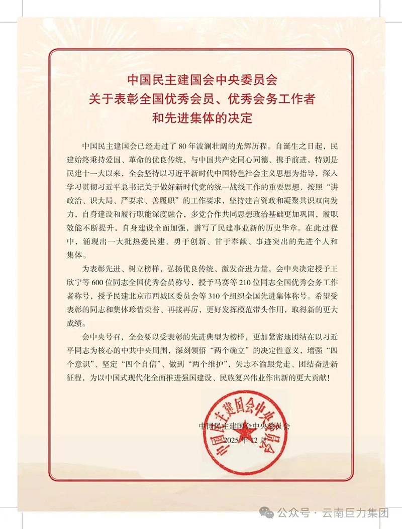 八秩同心筑偉業(yè),砥礪奮進(jìn)譜新篇。2025年12月17日,慶祝中國(guó)民主建國(guó)會(huì)成立80周年大會(huì)在京隆重召開,大會(huì)對(duì)民建全國(guó)優(yōu)秀會(huì)員、會(huì)務(wù)工作者及先進(jìn)集體進(jìn)行表彰。云南民建喜獲豐收,14名會(huì)員、8個(gè)組織榮獲民建全國(guó)優(yōu)秀會(huì)員、優(yōu)秀會(huì)務(wù)工作者、先進(jìn)集體表彰。云南巨力集團(tuán)董事長(zhǎng)、民建云南省委常委、直屬園區(qū)基層委主委王國(guó)新先生榮登“民建全國(guó)優(yōu)秀會(huì)員”光榮榜!這一榮譽(yù)不僅是對(duì)他個(gè)人的高度肯定,更是對(duì)他多年來在企業(yè)發(fā)展、參政議政和社會(huì)責(zé)任履行等方面卓越貢獻(xiàn)的認(rèn)可。